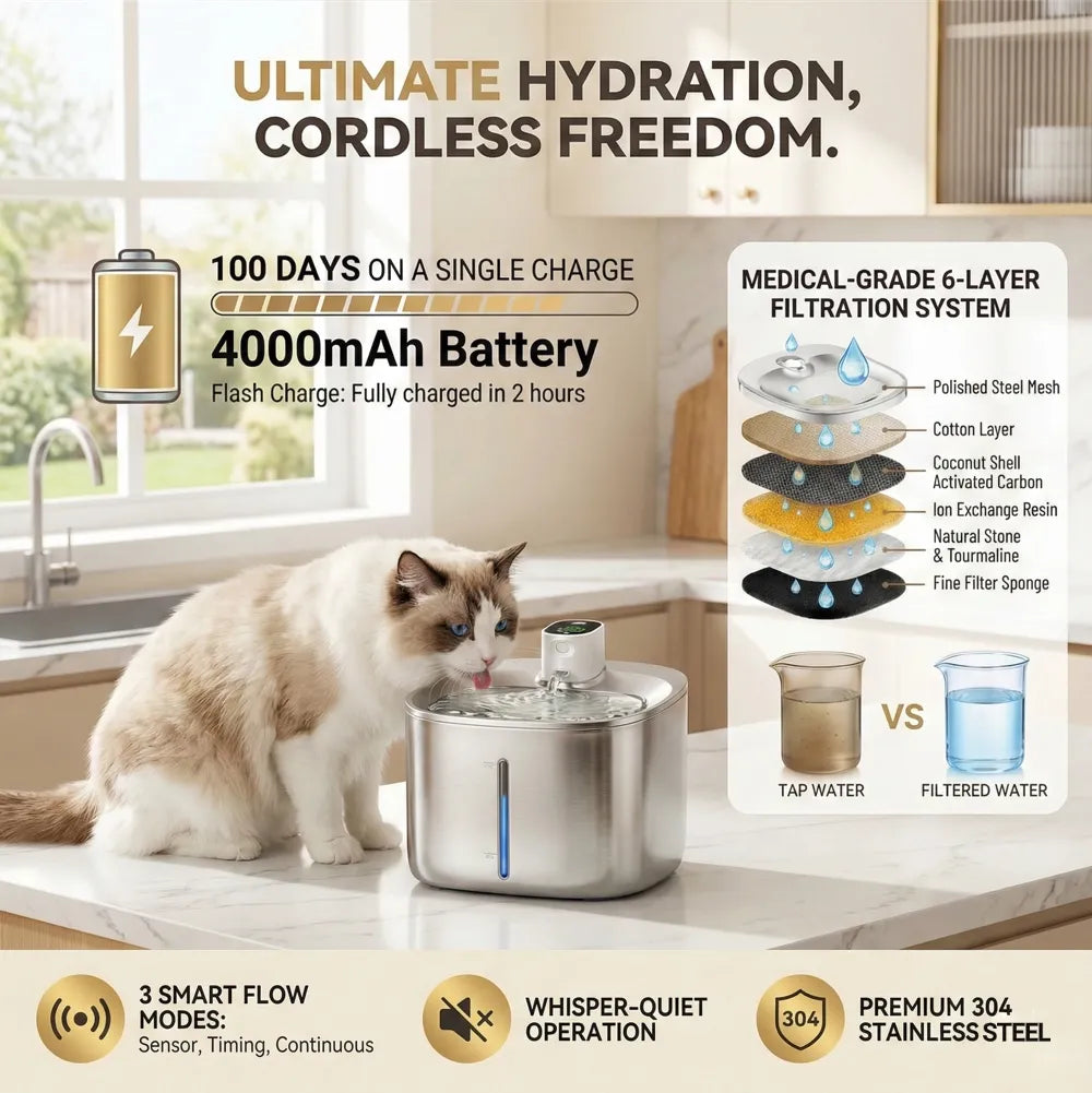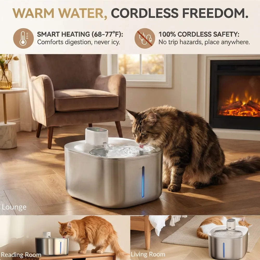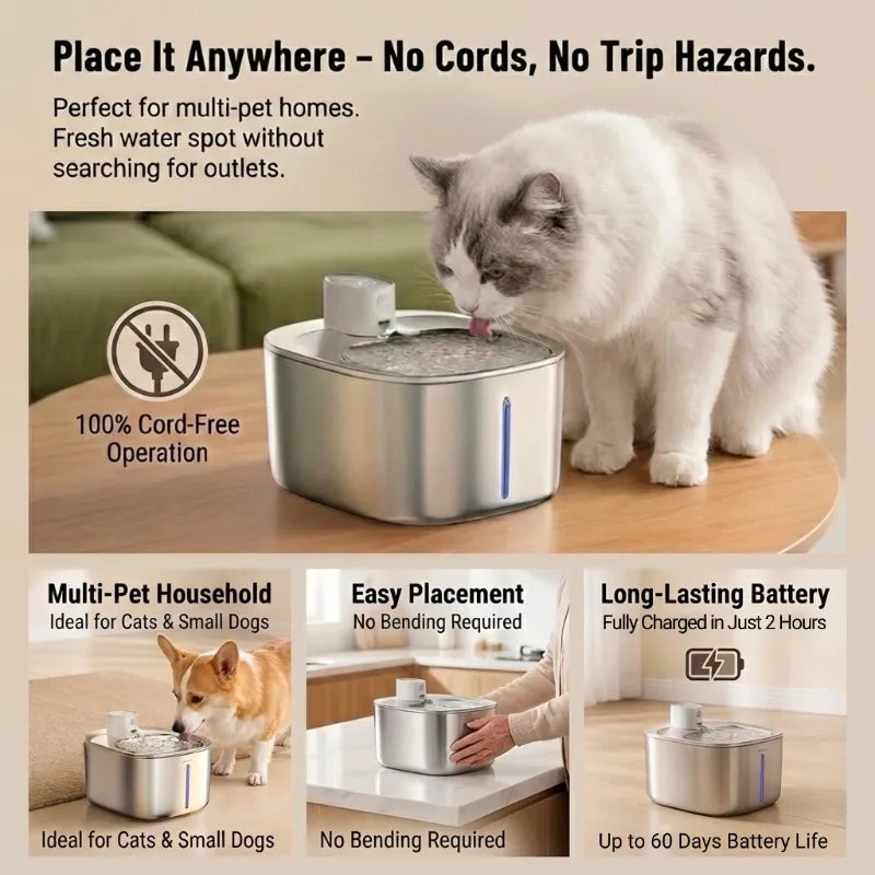 Go wire-free to eliminate tripping hazards and chewing risks. Place it anywhere while smart thermal control keeps water at a refreshing 68–77°F (20–25°C)—ensuring healthy hydration year-round.