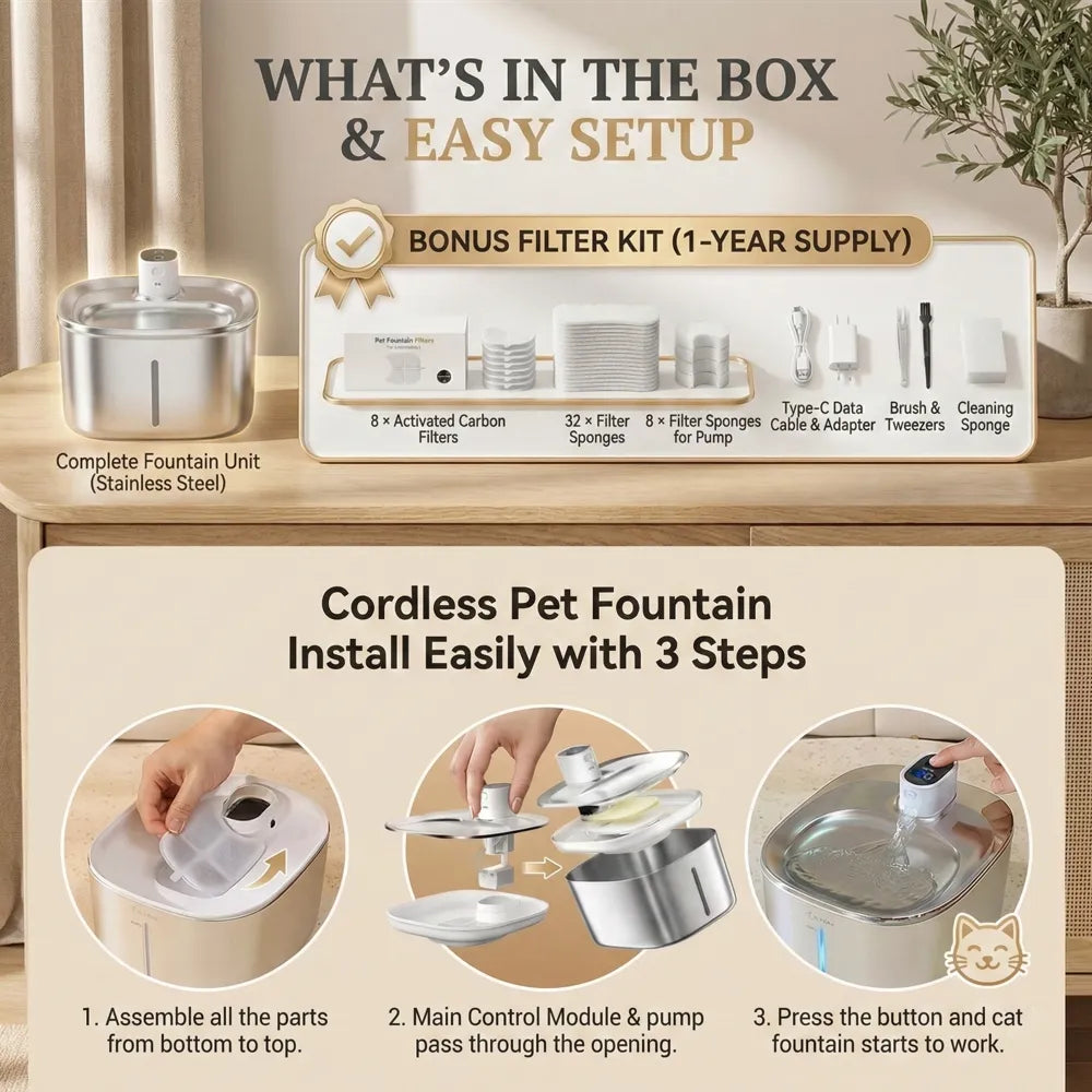 Forget about buying replacement filters for a while. We've included the complete "Annual Wellness Kit" (8 Carbon Filters + 32 Sponges) absolutely FREE. That’s 365 days of crystal-clean water for your fur baby, without spending an extra dime.